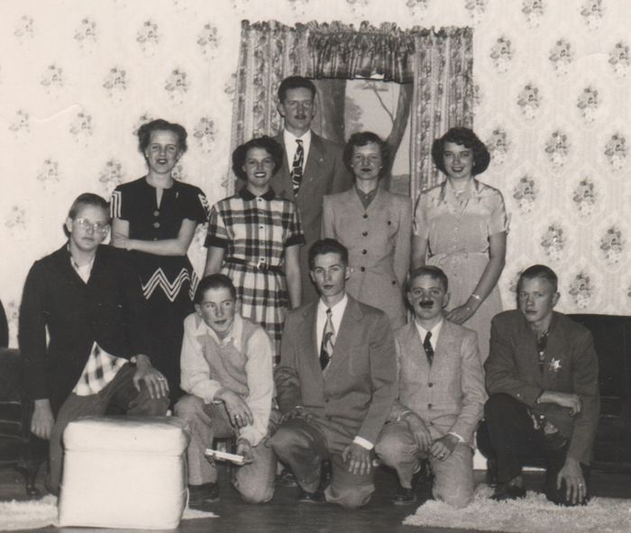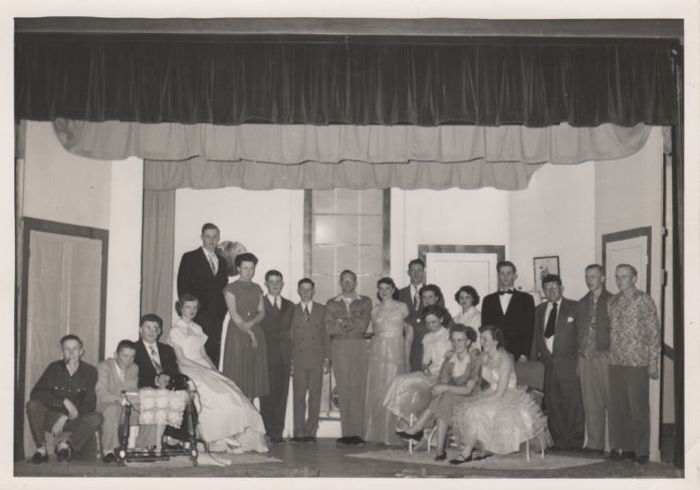 Cast of a Play--back row Ray Bowyer; middle row (l-r) Edna Fletcher, Regina Boetger, Carol Allen, Patricia Simmons; front row (l-r) Fred Palmer, Jack Hubbard, Don Gotschall, Don Webb, Ken Steinke